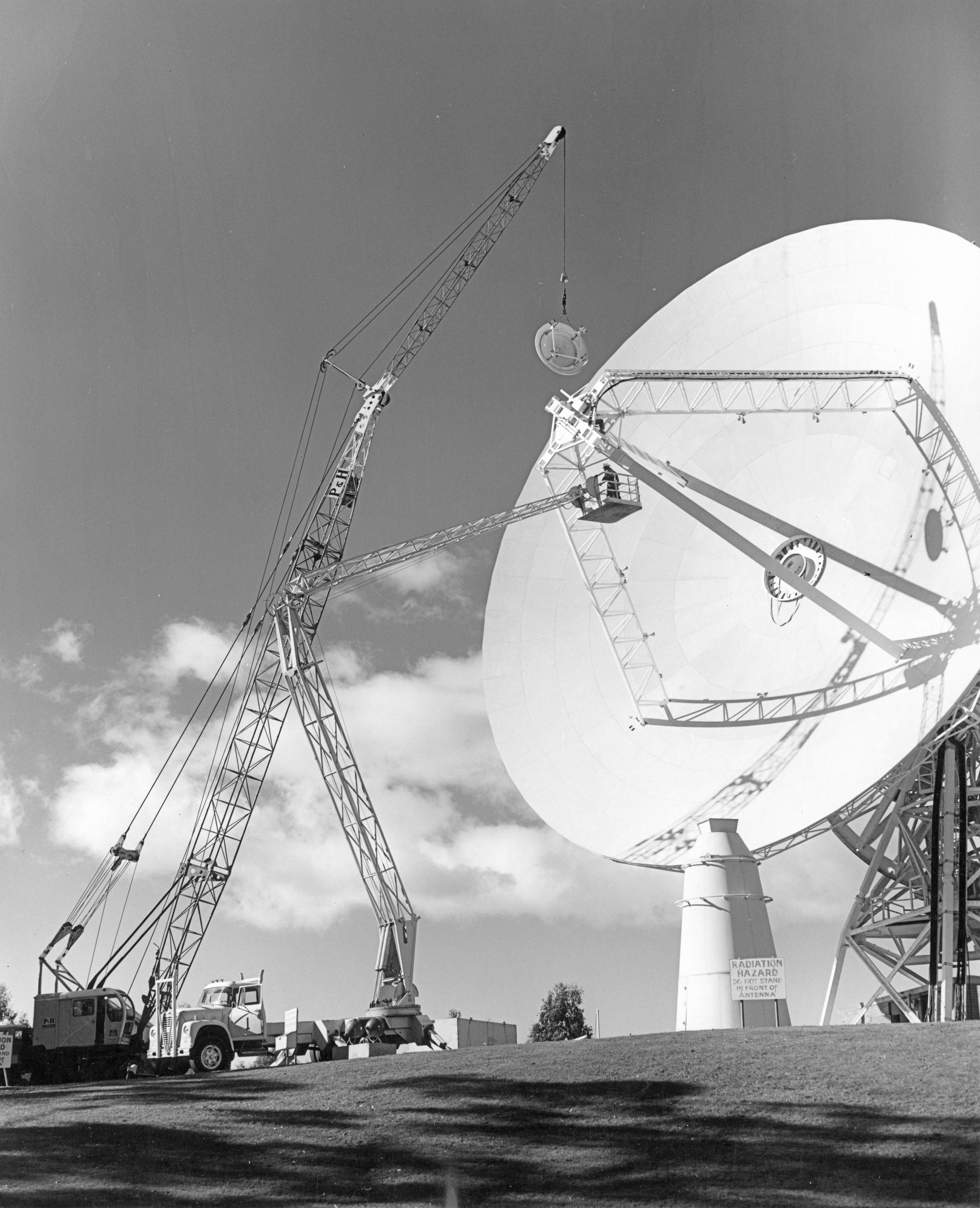 The feedcone is now on the ground, and the subreflector is also being hoisted away. The acquisition aid, which had been mounted at the top of the quadripod, has already been removed. |