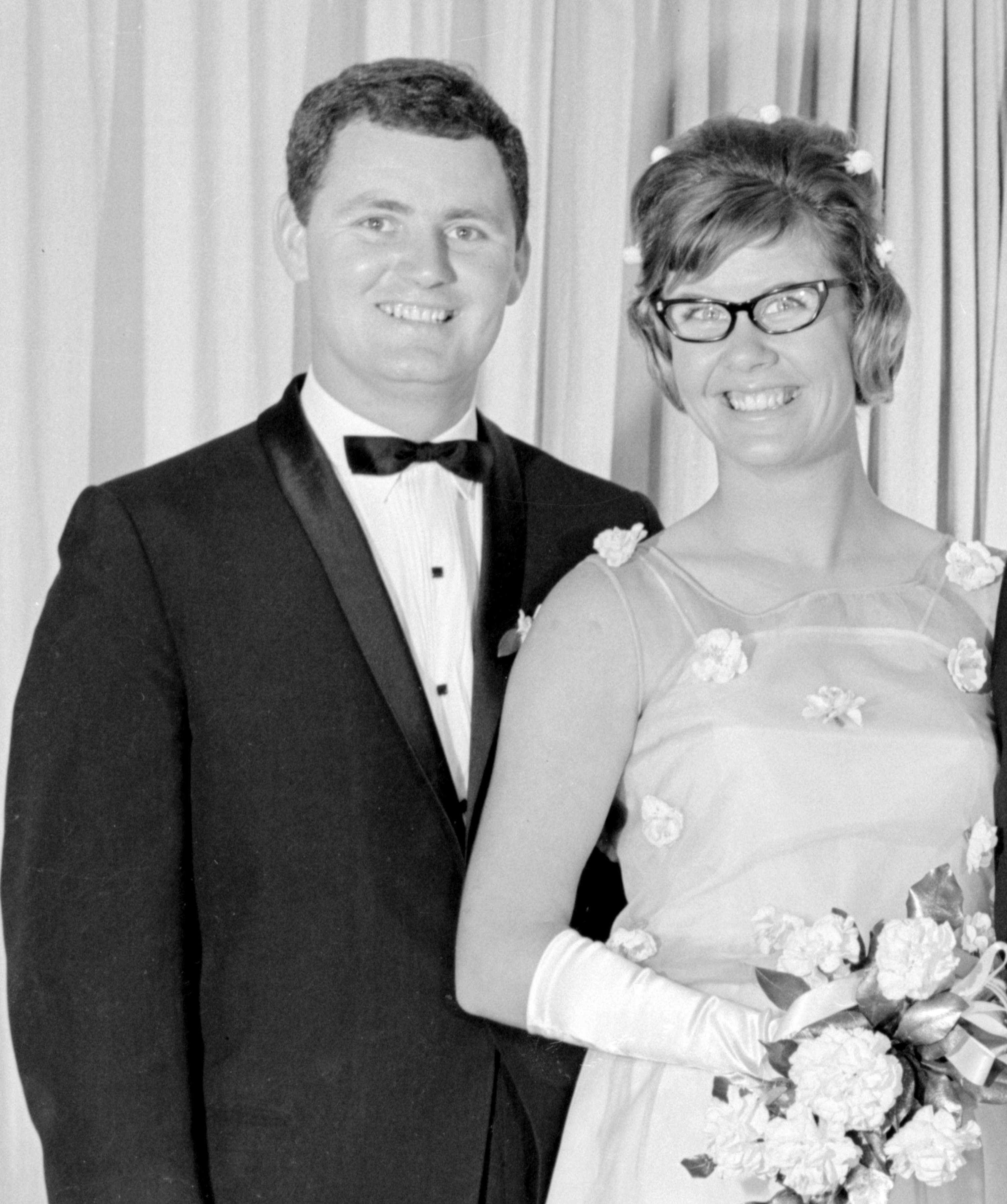 Karin and her fiancé John Lambie at the wedding of Pete and Bea Peterson in Carnarvon. Photo: Hamish Lindsay. Scan: Colin Mackellar. |