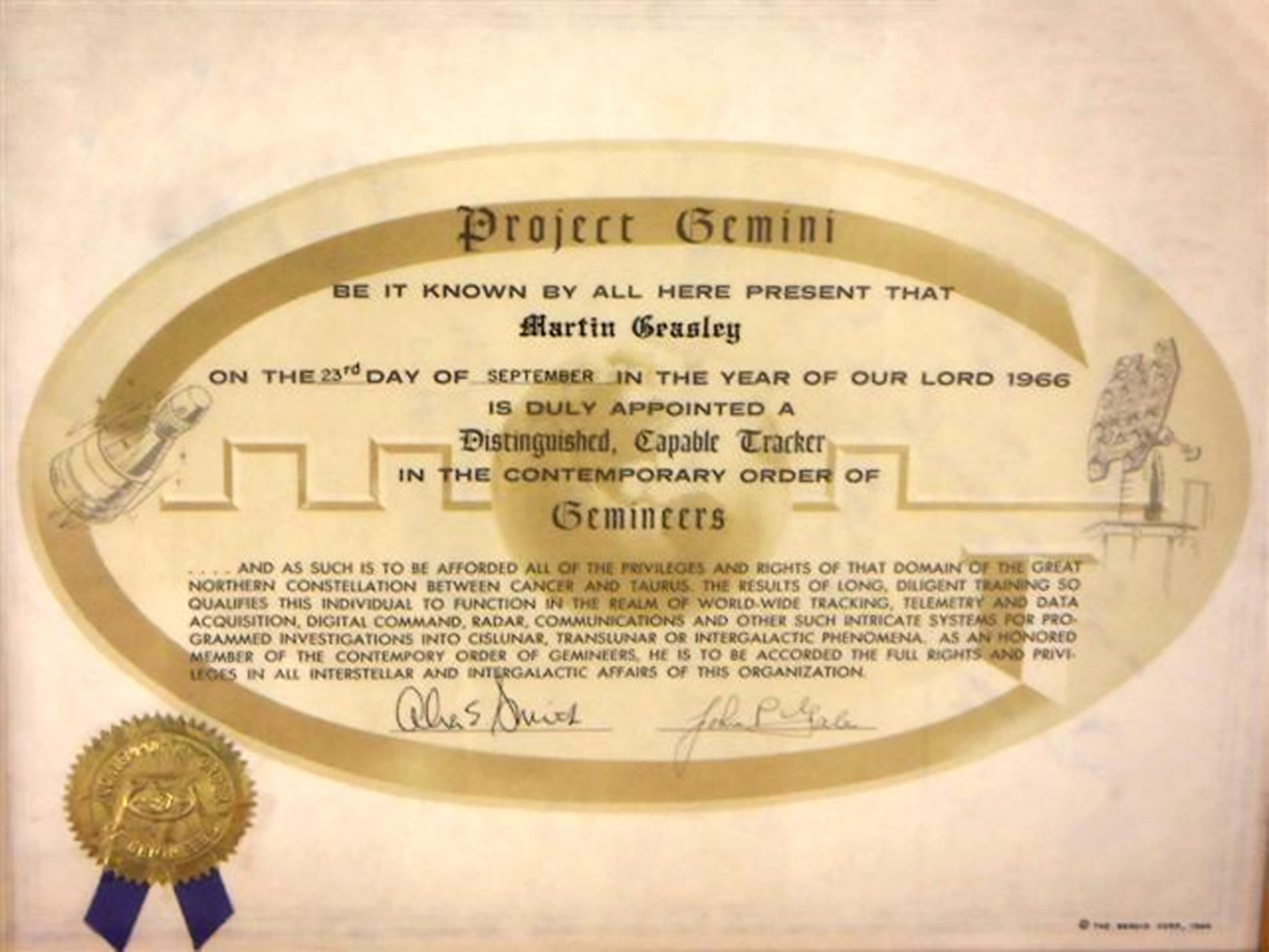 Martin received this award as “a Distinguished, Capable tracker in the Contemporary Order of Gemineers” in September 1966. Martin writes, “Whilst doing my Apollo 3 months training at Goddard Space Flight Centre, I was drafted to the Gemini 12 Mission support”. The certificate reads: |
