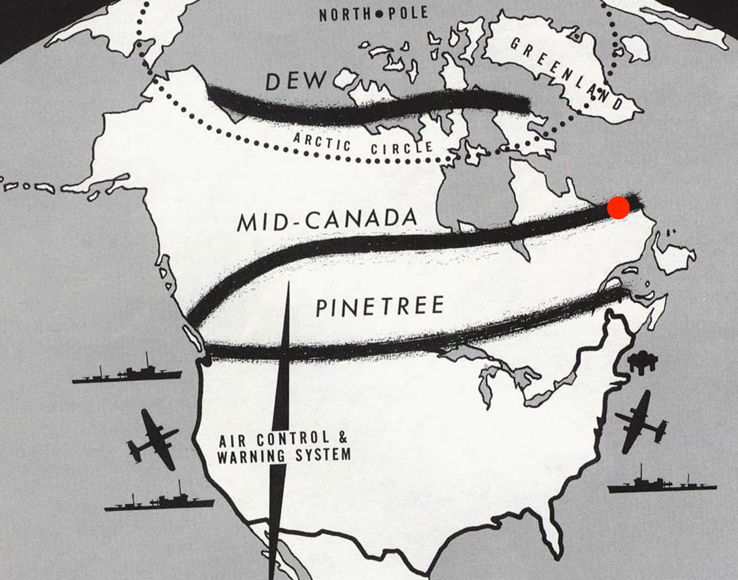 Goose Bay, on the Mid-Canada Line, is marked with the red spot. |