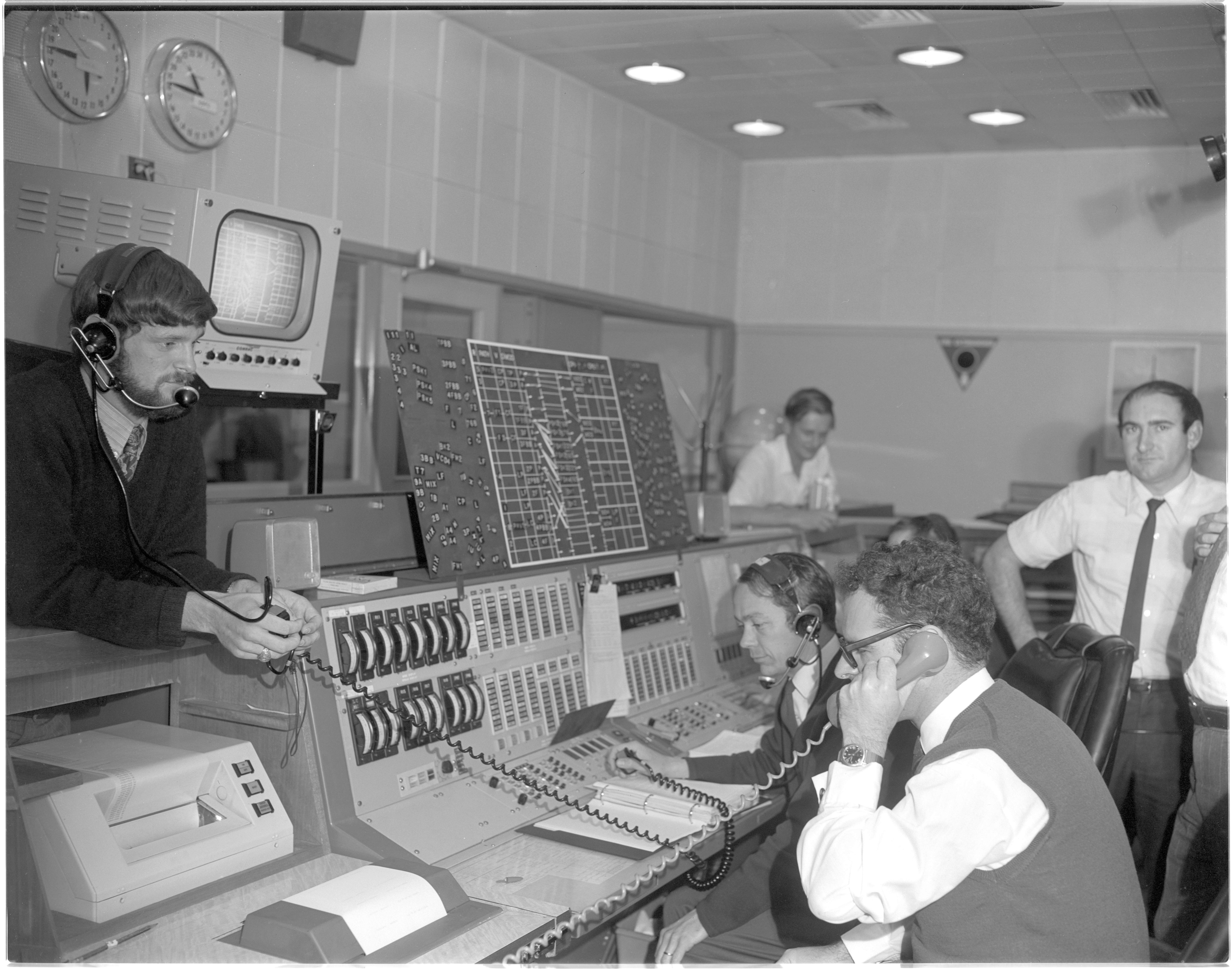 On 15 June 1971, Goddard Space Flight Center’s Super Constellation NASA 421 overflies the station while Sim personnel run the Honeysuckle team through their paces. At left, Simulation Conductor Evan Gull watches Mike Evenett (centre, on the console) and Ian Grant (foreground) as they prepare to support Apollo 15. Image: HSK 5/9/7/3 - 63. Photo by Hamish Lindsay. |
