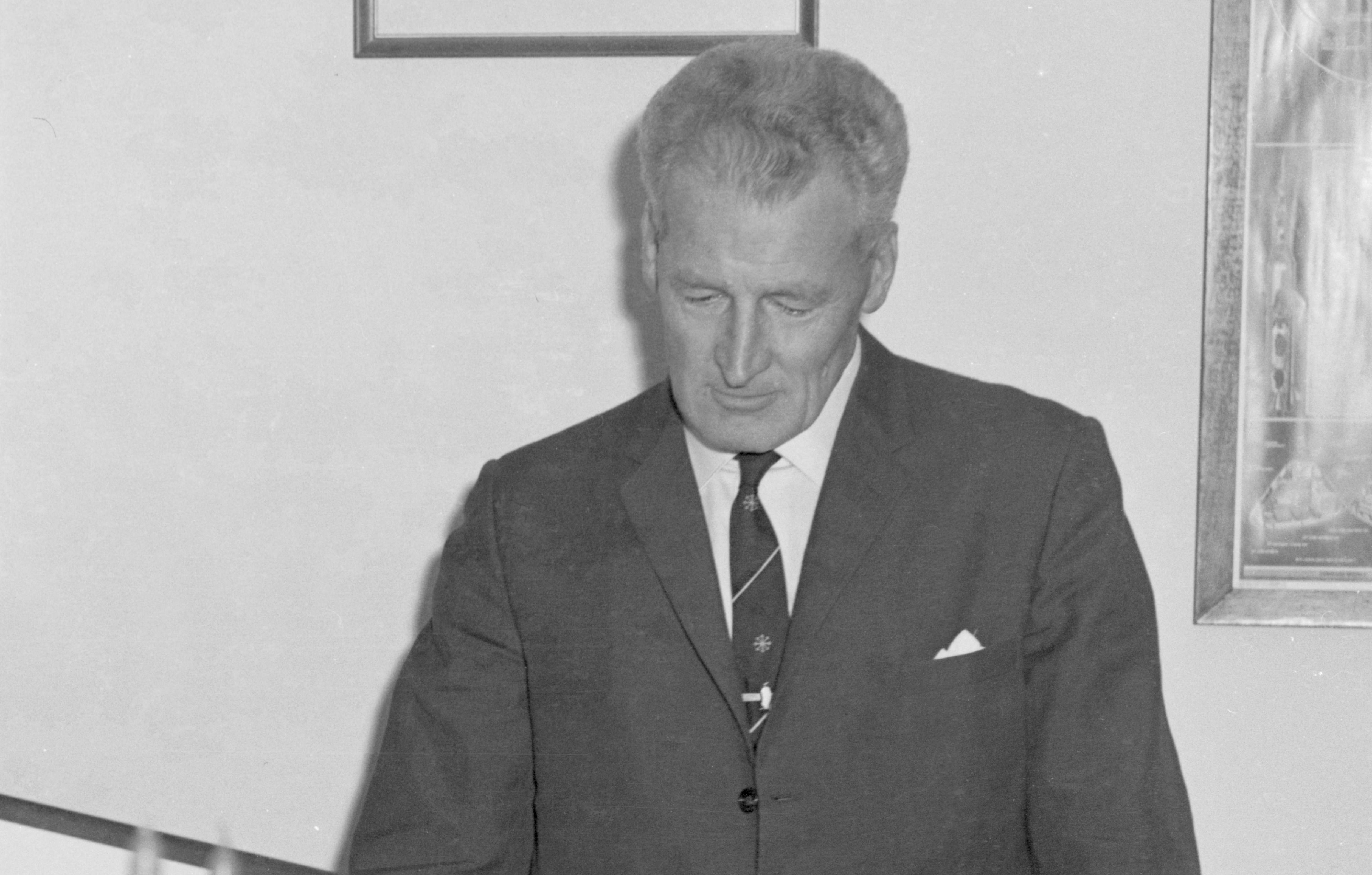 Tom Lawrence, wearing the DOS tie, at a lunch in honour of George Mueller at Honeysucle Creek in December 1969. Photo: Hamish Lindsay. |