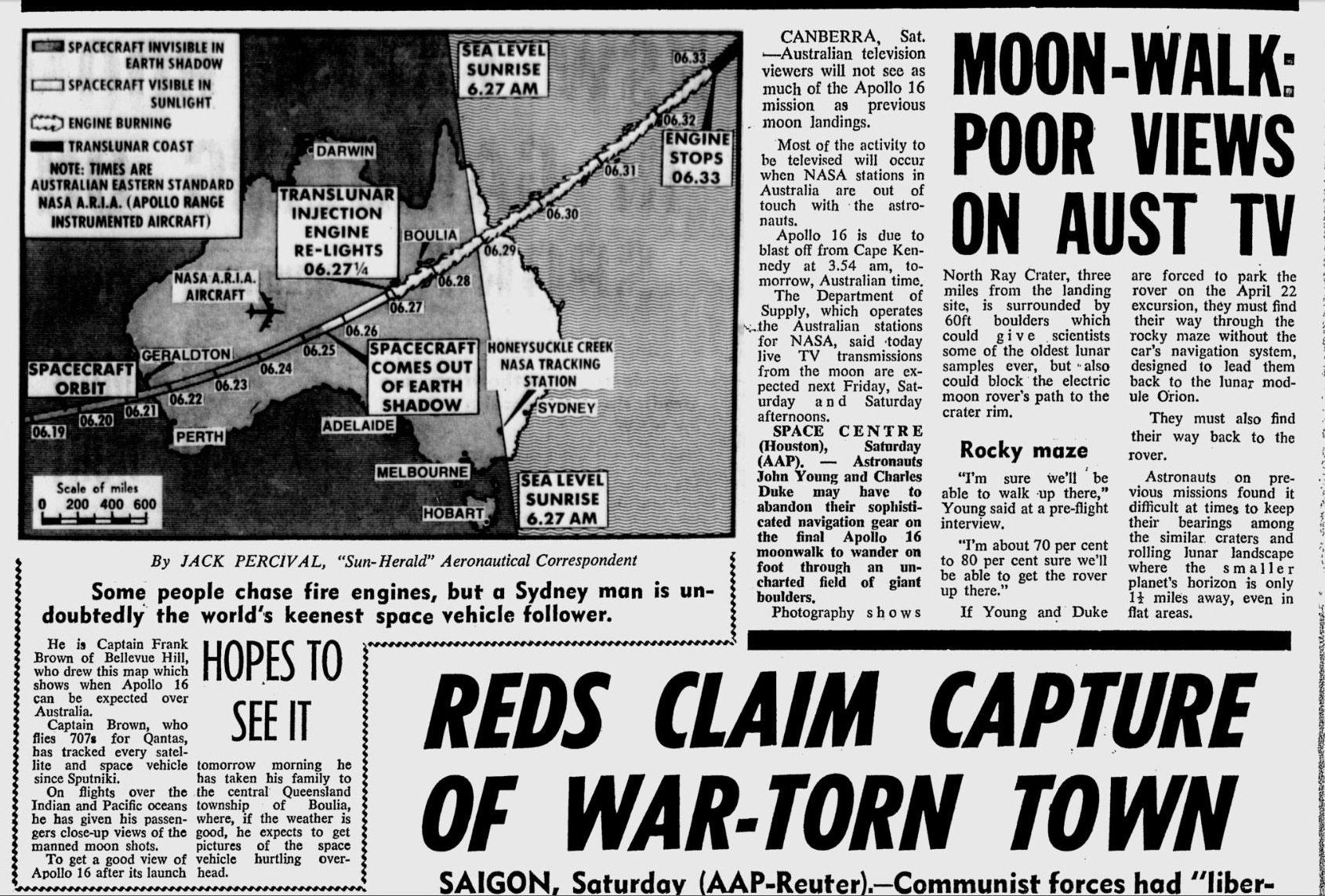 This diagram of Apollo 16’s TLI burn over Australia, was drawn by Qantas Captain Frank Brown, and published in Sydney’s Daily Telegraph on Sunday 16 April 1972. (Capt. Brown reported the re-entry of Apollo 11 live on ABC Radio.) Click for the accompanying article. Scan: Colin Mackellar. |