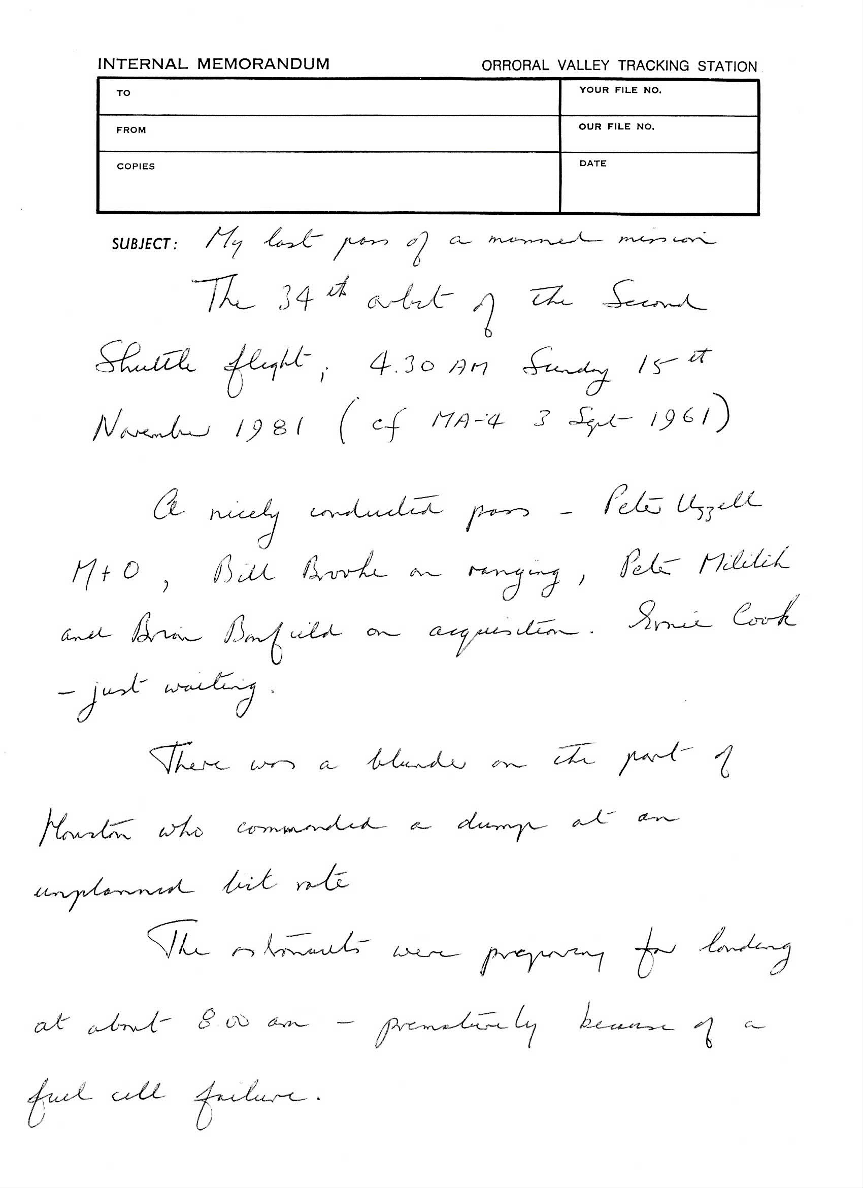 In the memo Dad reflects on the first tracking that he oversaw, from Muchea in 1961, this being MA-4 – the orbital flight of an unmanned Mercury capsule for which Scott Carpenter was in attendance.” |