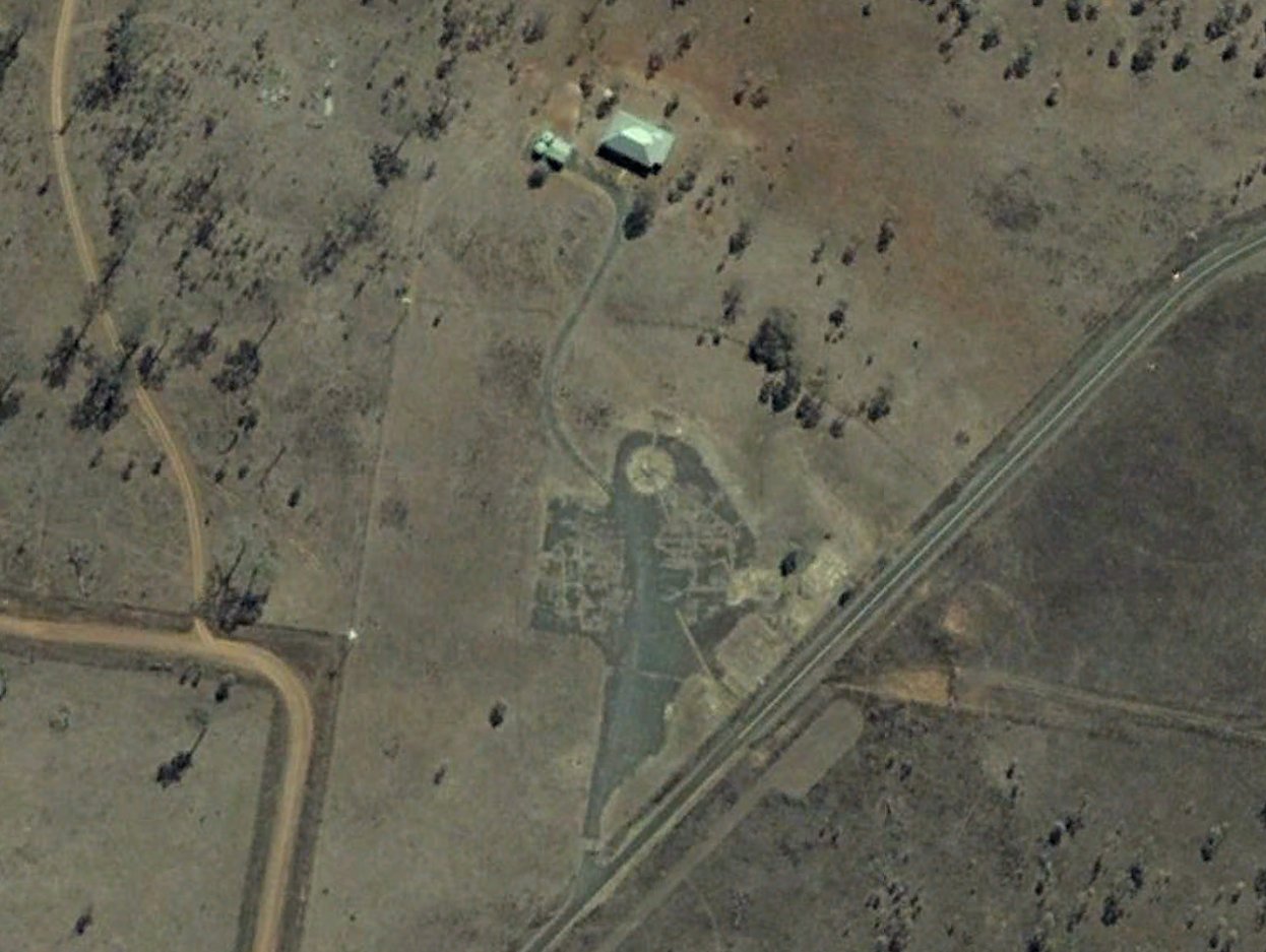 The Cooby Creek Tracking Station site at 18th August 2006, courtesy Google Earth. The old main entrance now leads to a farmhouse just north of the station. |