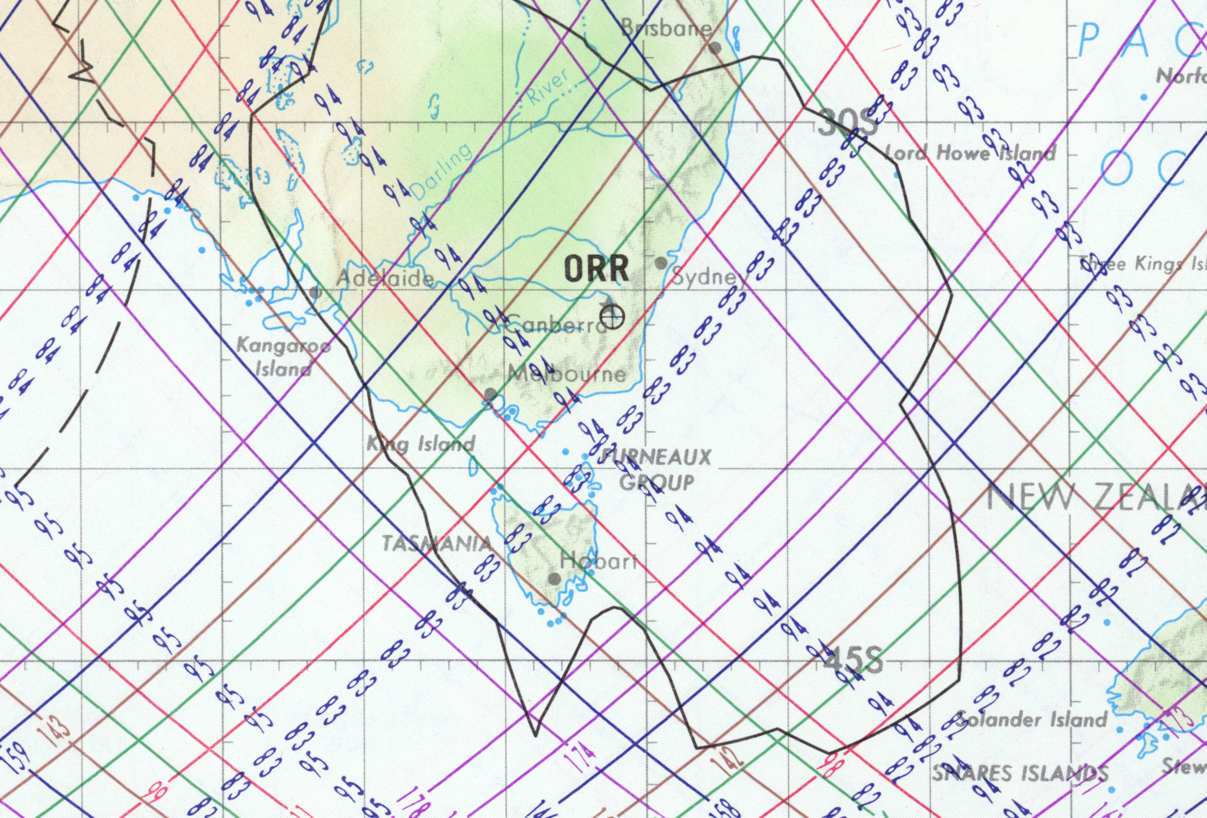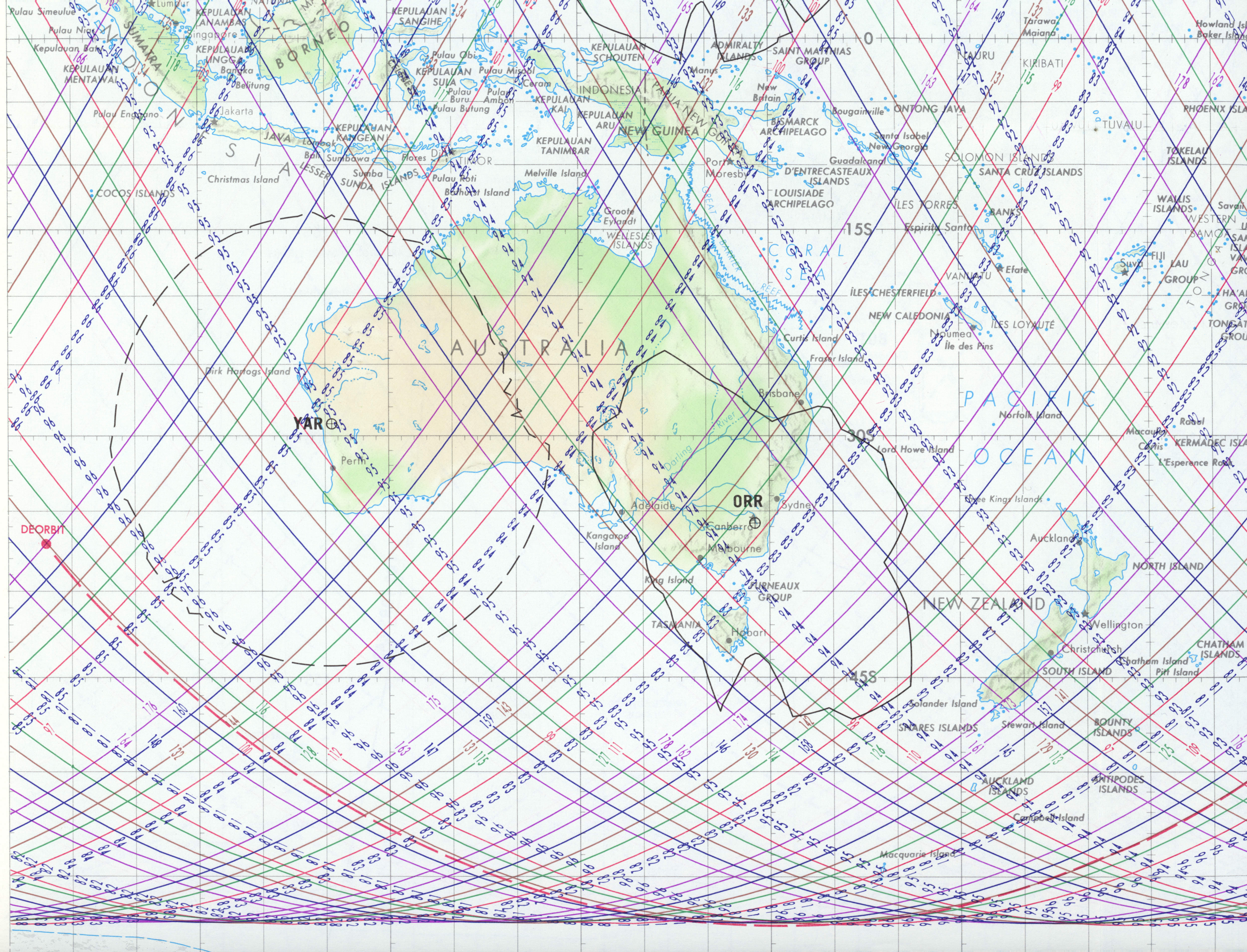 The red line indicates Orbit 110 in this STS-9 groundtrack map preserved by Philip Clark. The Shuttle was travelling from top left to lower right, passing right over Melbourne. Scan: Colin Mackellar. |