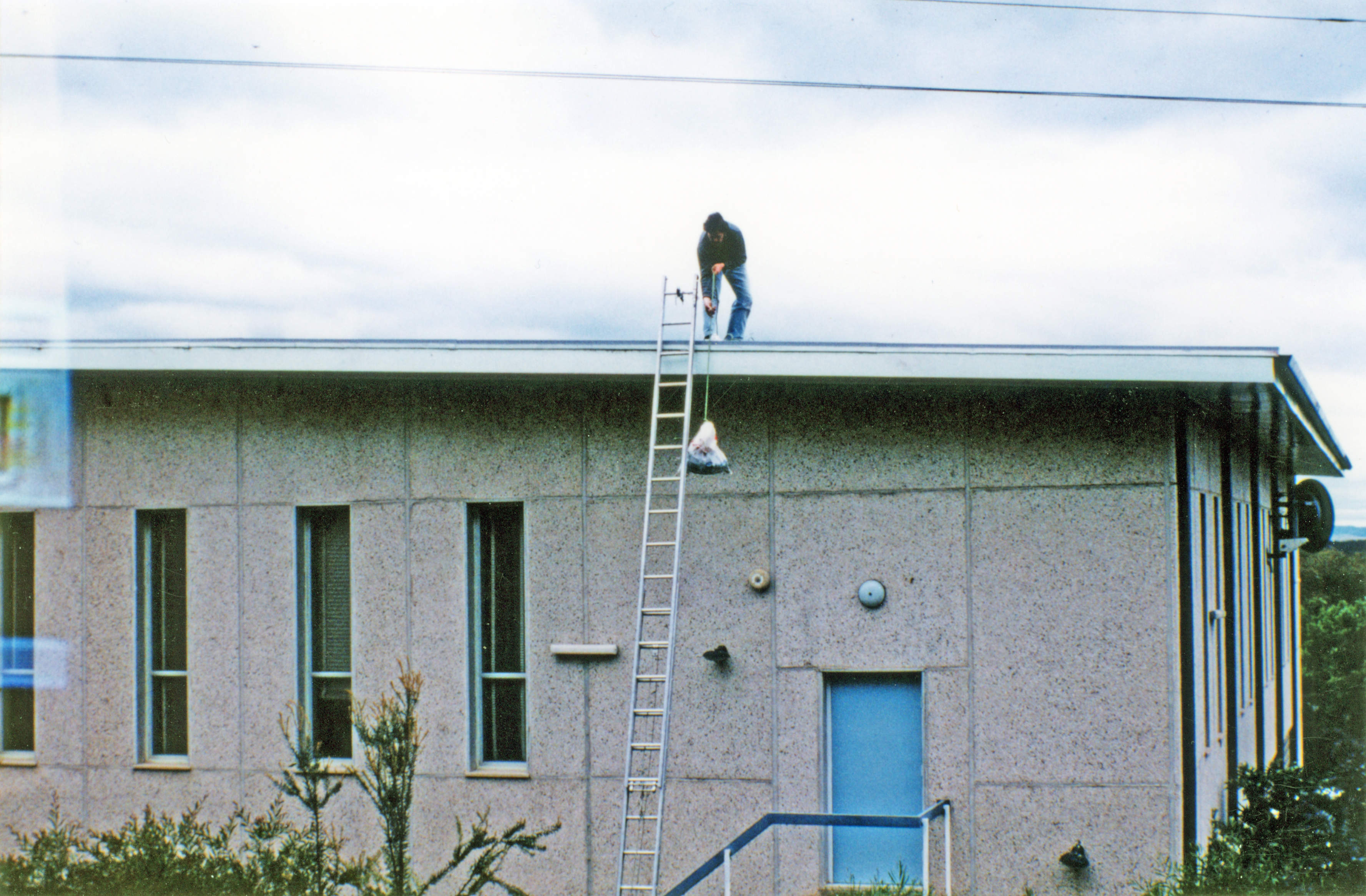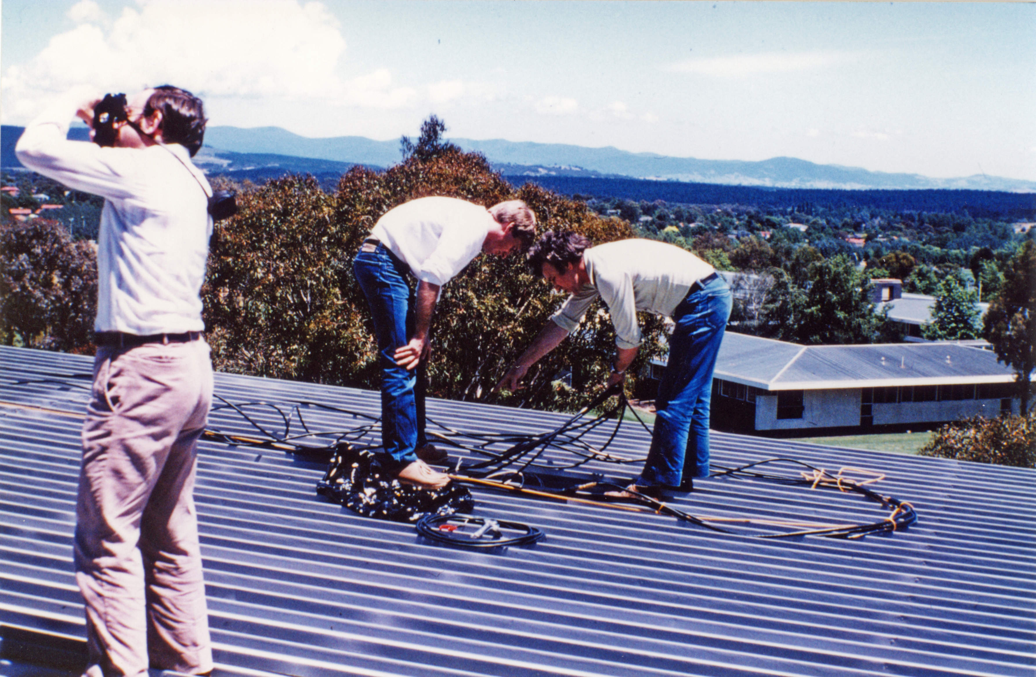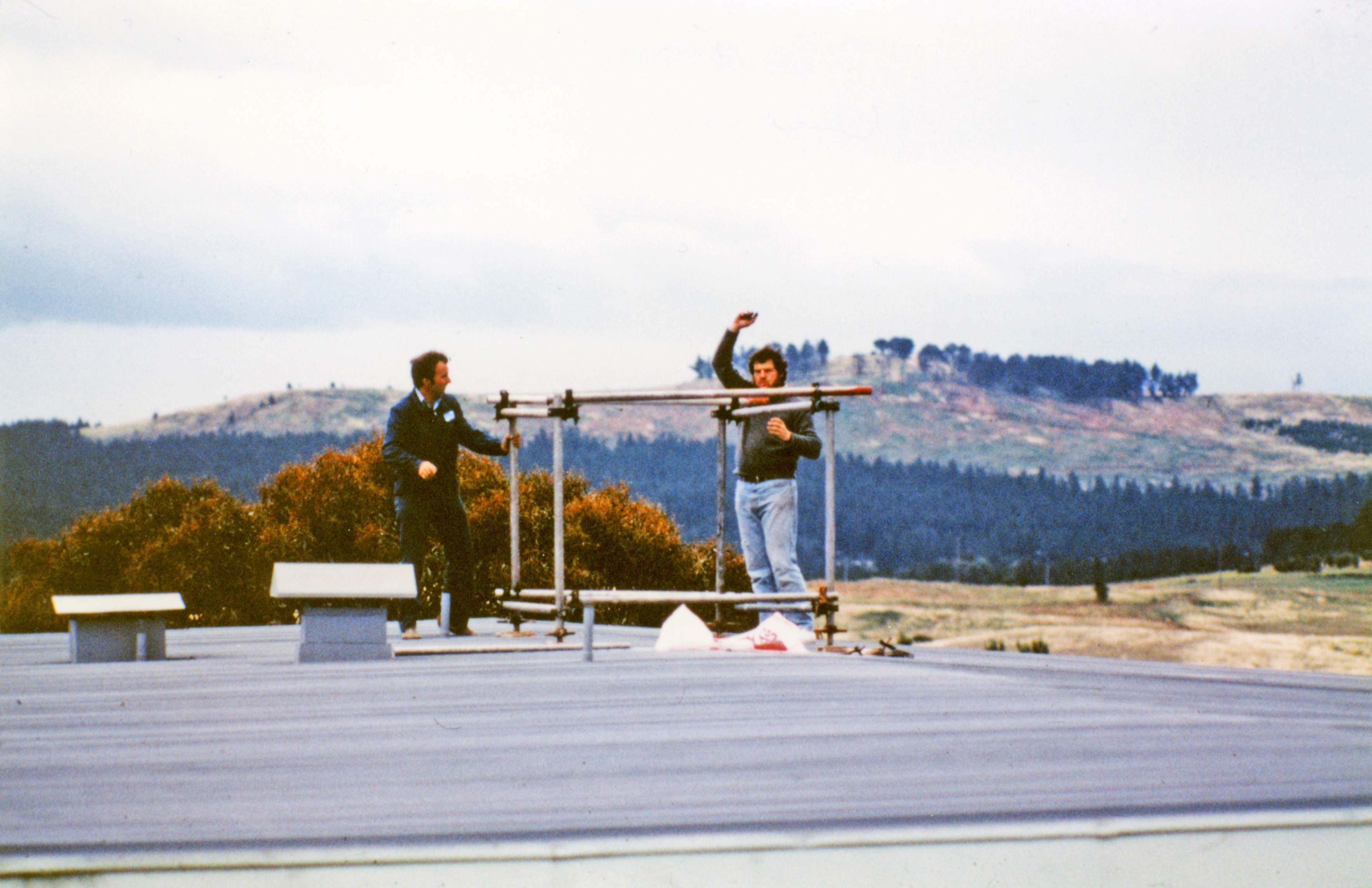 Dick Elliott hauls the first bag of antenna parts onto the roof of Deakin Exchange. This, and other photos of the test, courtesy Philip Clark. Scanned by Colin Mackellar. |