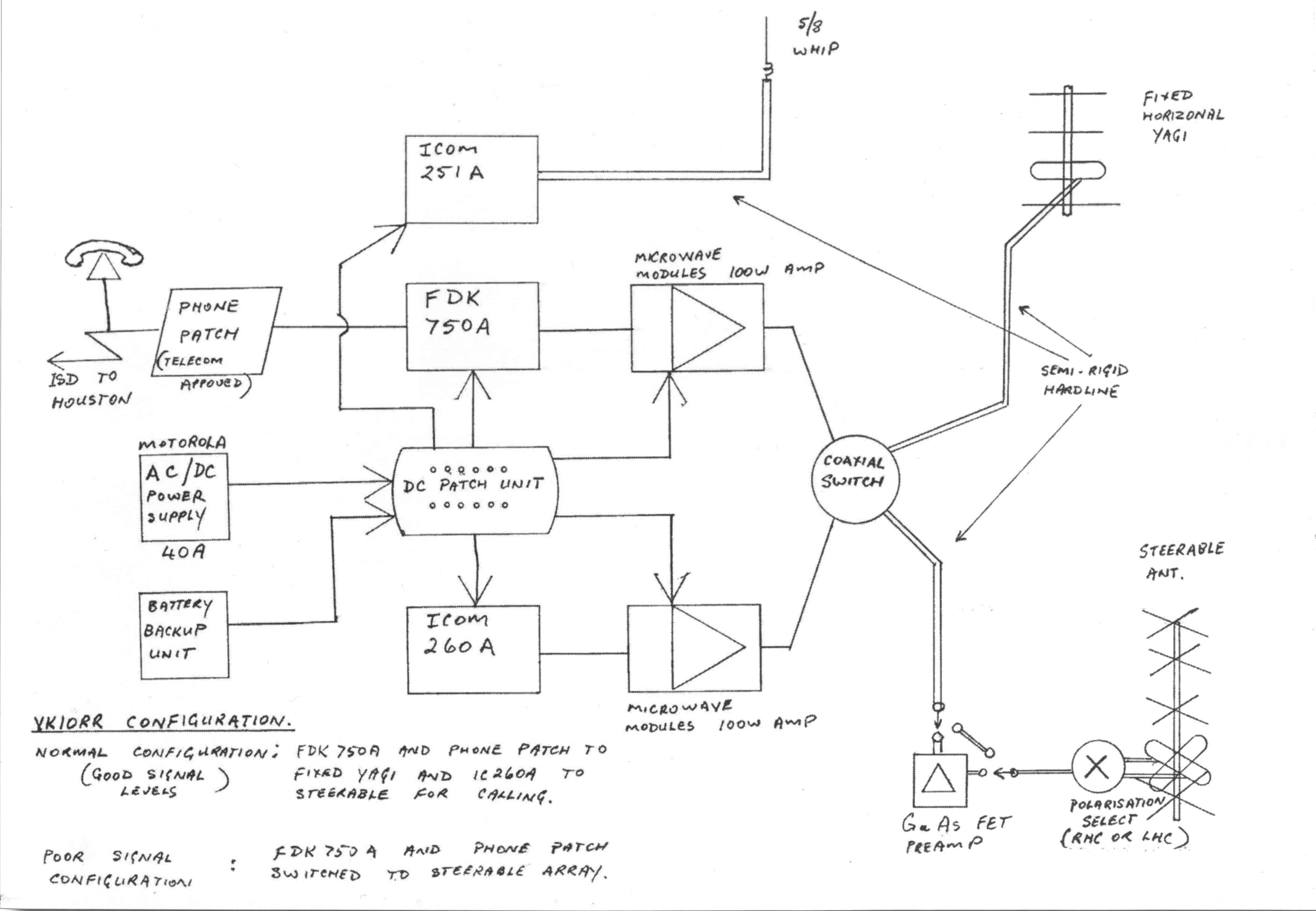 A block diagram of VK1ORR, courtesy of Philip Clark. (Abbreviation for the telephone link to Houston, ISD = International Subscriber Dialling, the Australian equivalent to the US terminology IDDD = International Direct Distance Dialing.) |