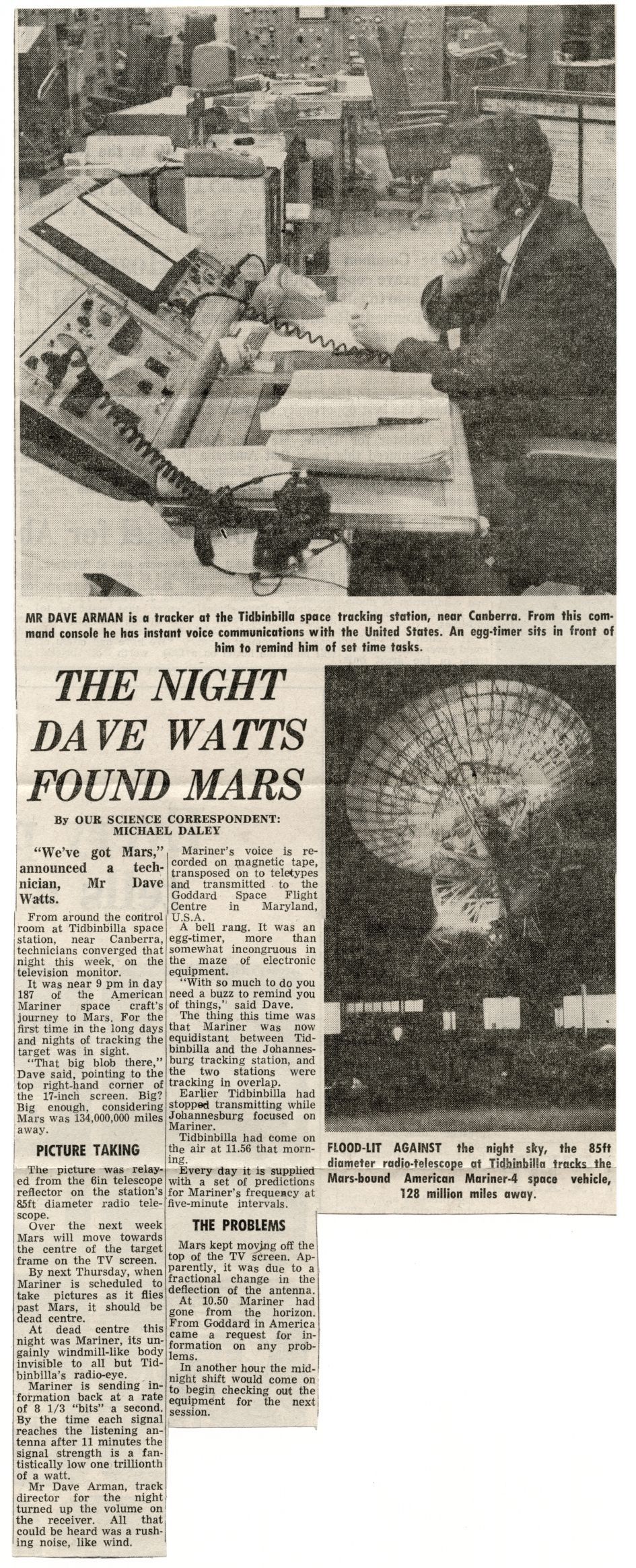 Les Whaley saved this newspaper clipping of a story by Australian Science journalist Michael Daley. Dave Arman at Tidbinbilla is pictured. |