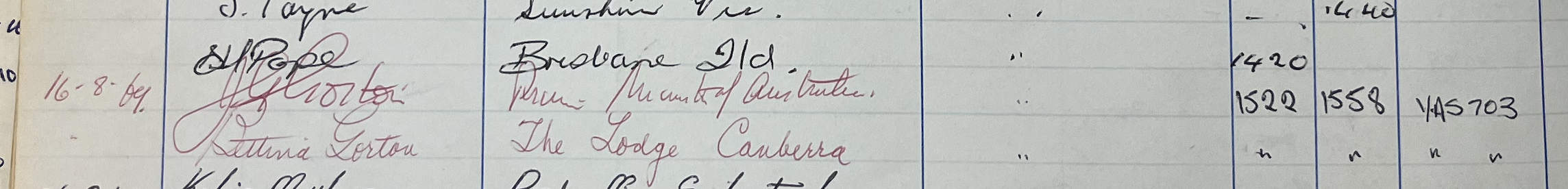 The Gortons’ signatures in the Security Visitors Book. Original in the Tidbinbilla archives. Scan by Colin Mackellar. |