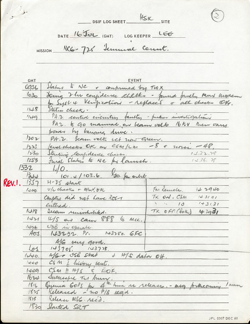 Ken Lee’s entries in the Honeysuckle log for the countdown and launch of Apollo 11, 16 July 1969. Liftoff is at 1332 GMT. |