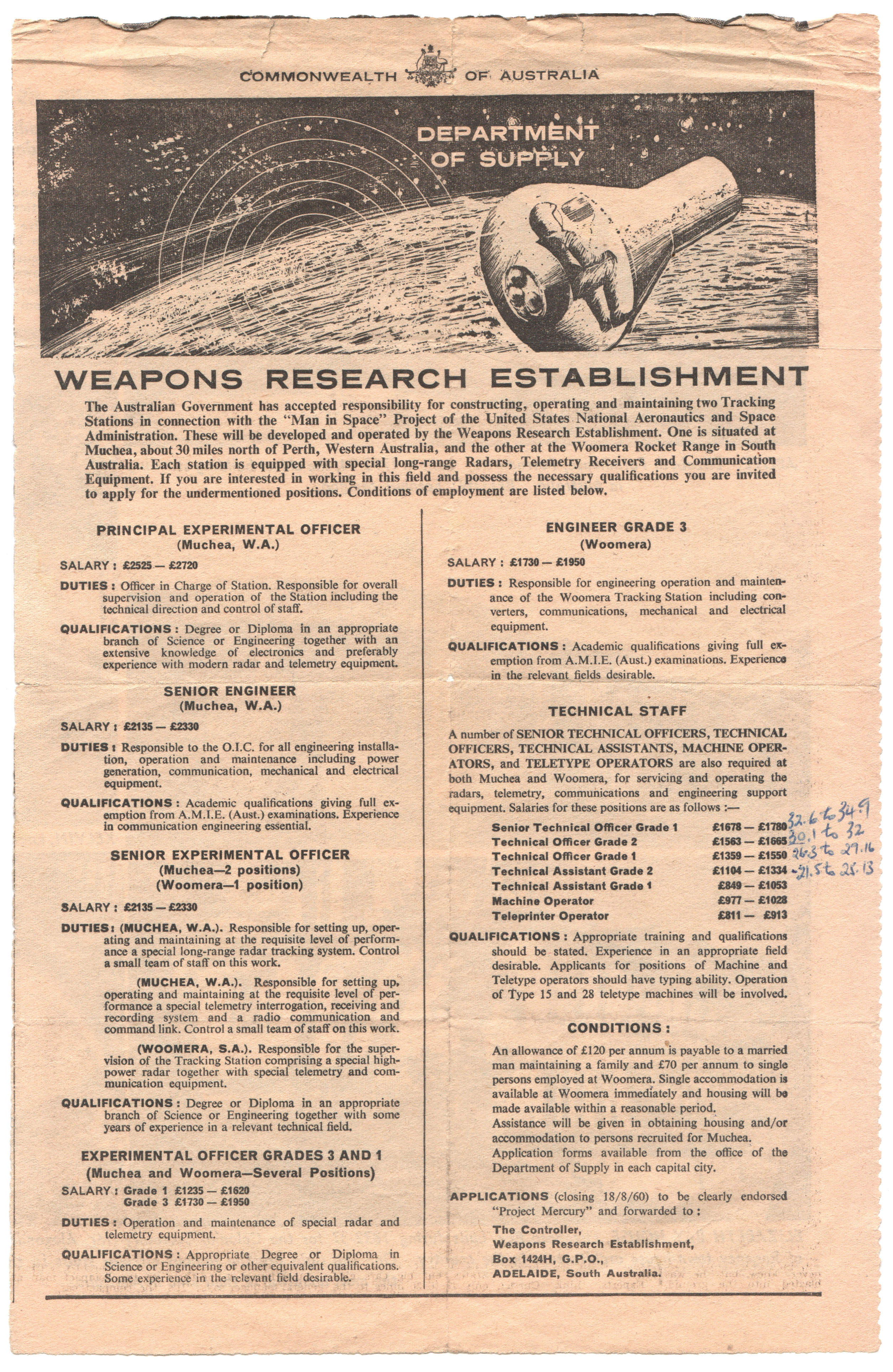 A newspaper advertisement for jobs at Muchea and Woomera (Red Lake). At Muchea, two Senior Experimental Officers are wanted for Radar: “Responsible for setting up, operating and maintaining at the requisite level of performance a special long-range radar tracking system. Control a small team of staff on this work.” Preserved by Jack Duperouzel. Scan by Colin Mackellar. |
