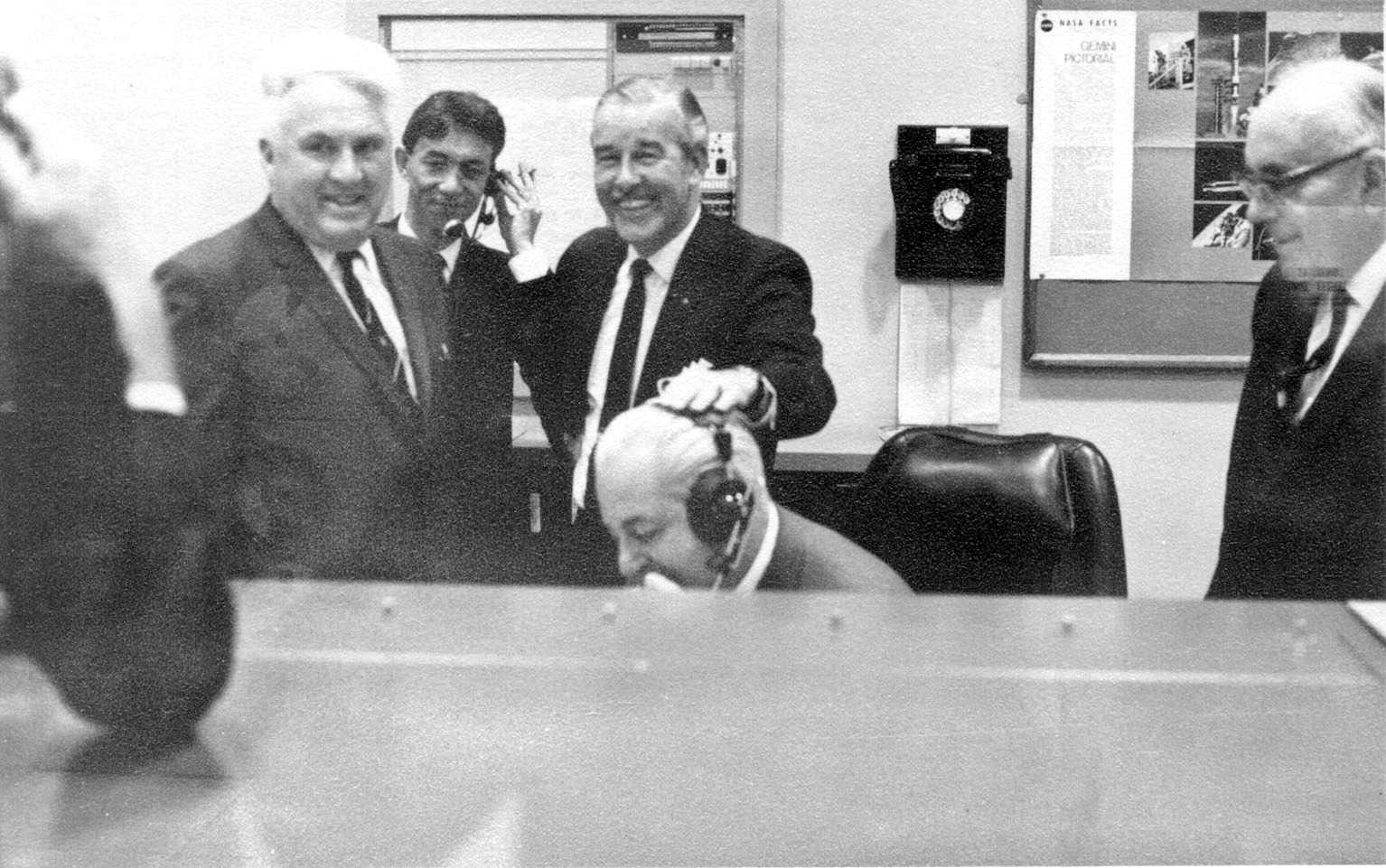 Ken holds Prime Minister Harold Holt’s headset in place as he speaks with US Vice President Hubert Humphrey at the Ops Console. From left to right: Edmond Buckley Associate Administrator for Tracking and Data Acquisition; Photo by Ron Hicks. |