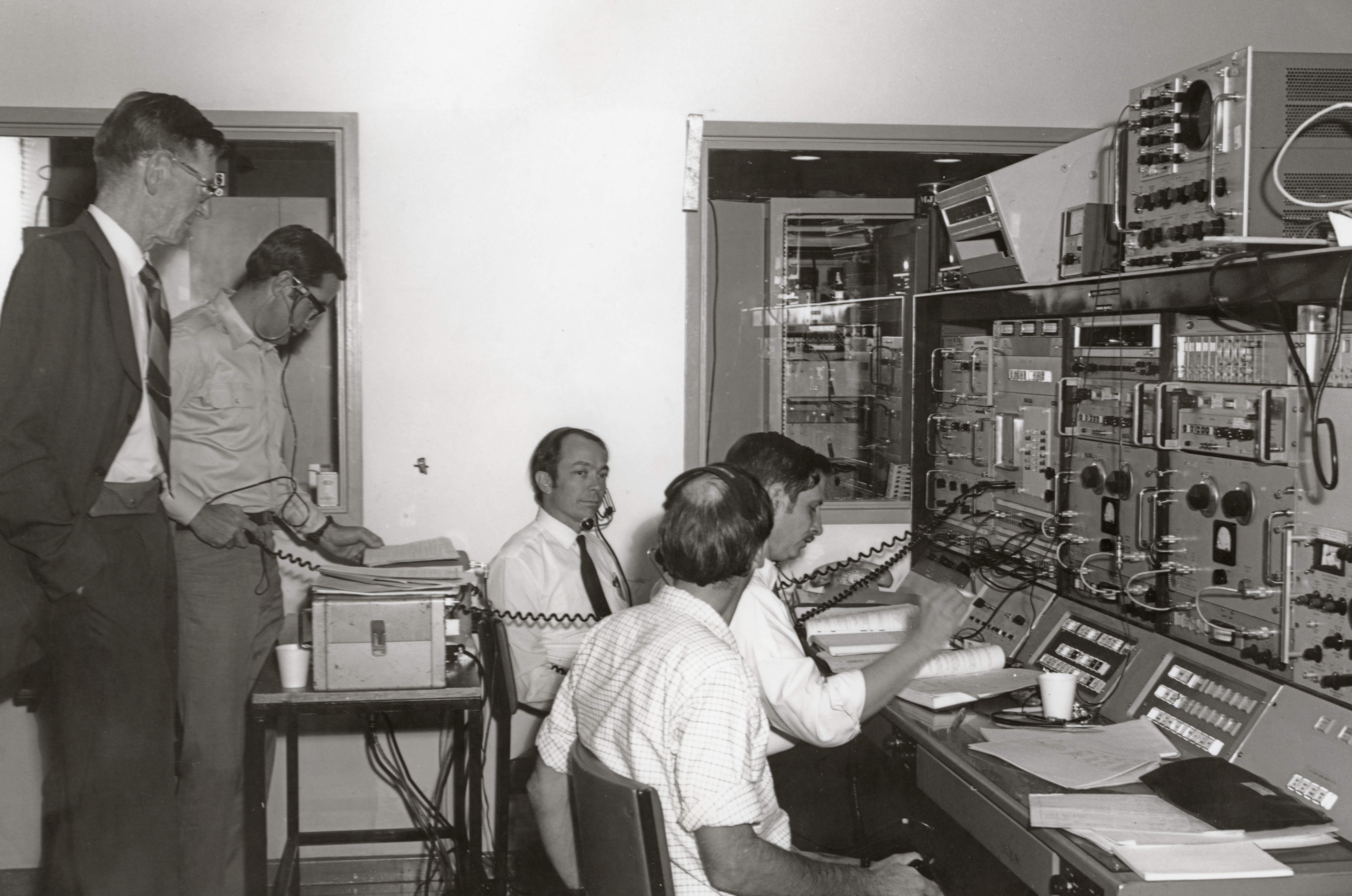 On 15 June 1971, Goddard Space Flight Center’s Super Constellation NASA 421 overflies the station while Sim personnel run the Honeysuckle team through their paces. At left, Simulation Conductor Evan Gull watches Mike Evenett (centre, on the console) and Ian Grant (foreground) as they prepare to support Apollo 15. Image: HSK 5/9/7/3 - 63. Photo by Hamish Lindsay. |