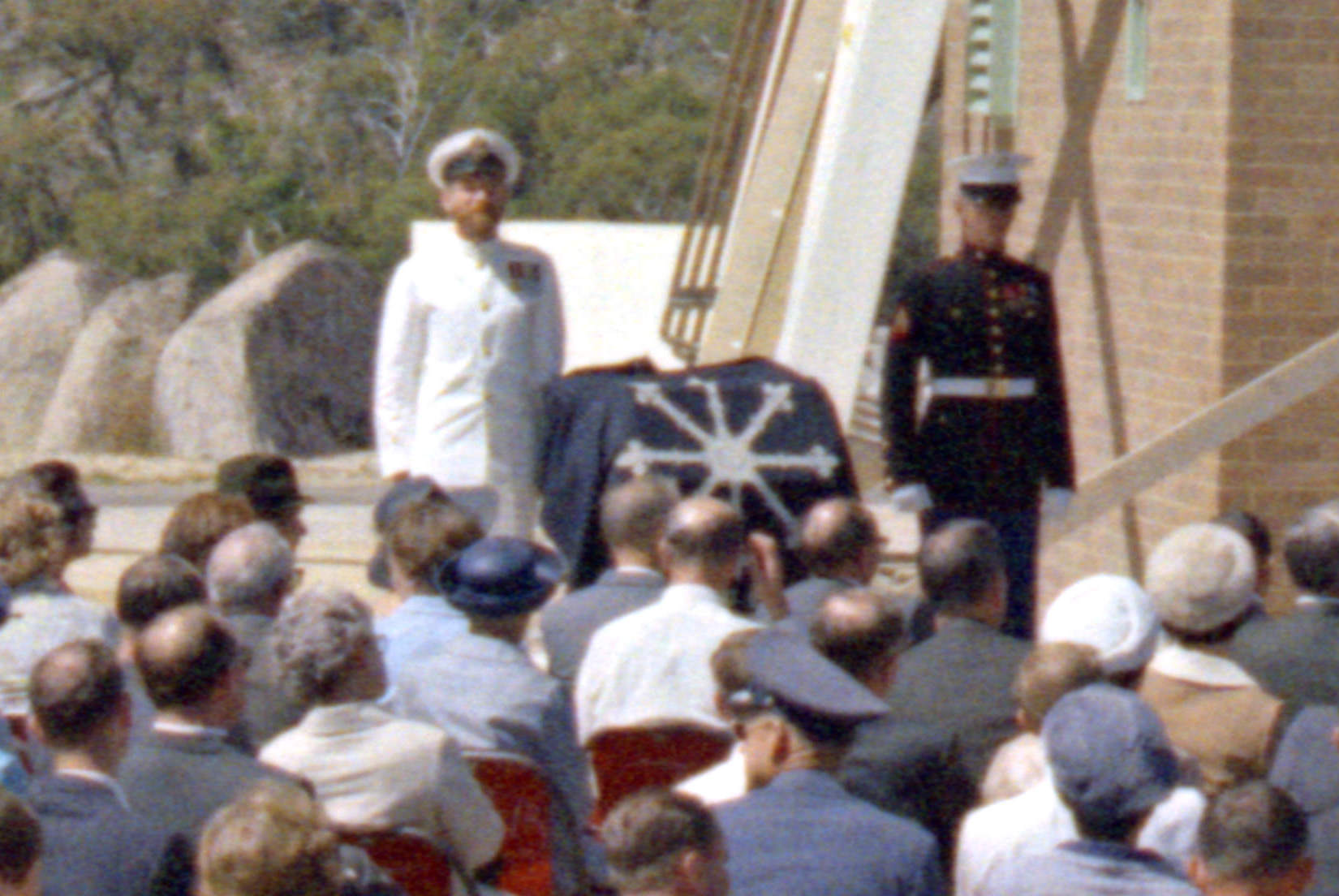 The Department of Supply crest covers the dedication plaque at the Opening Ceremony of Honeysuckle Creek on 17 March 1967. Detail from this Australian News and Information Service photo preserved by Hamish Lindsay. |