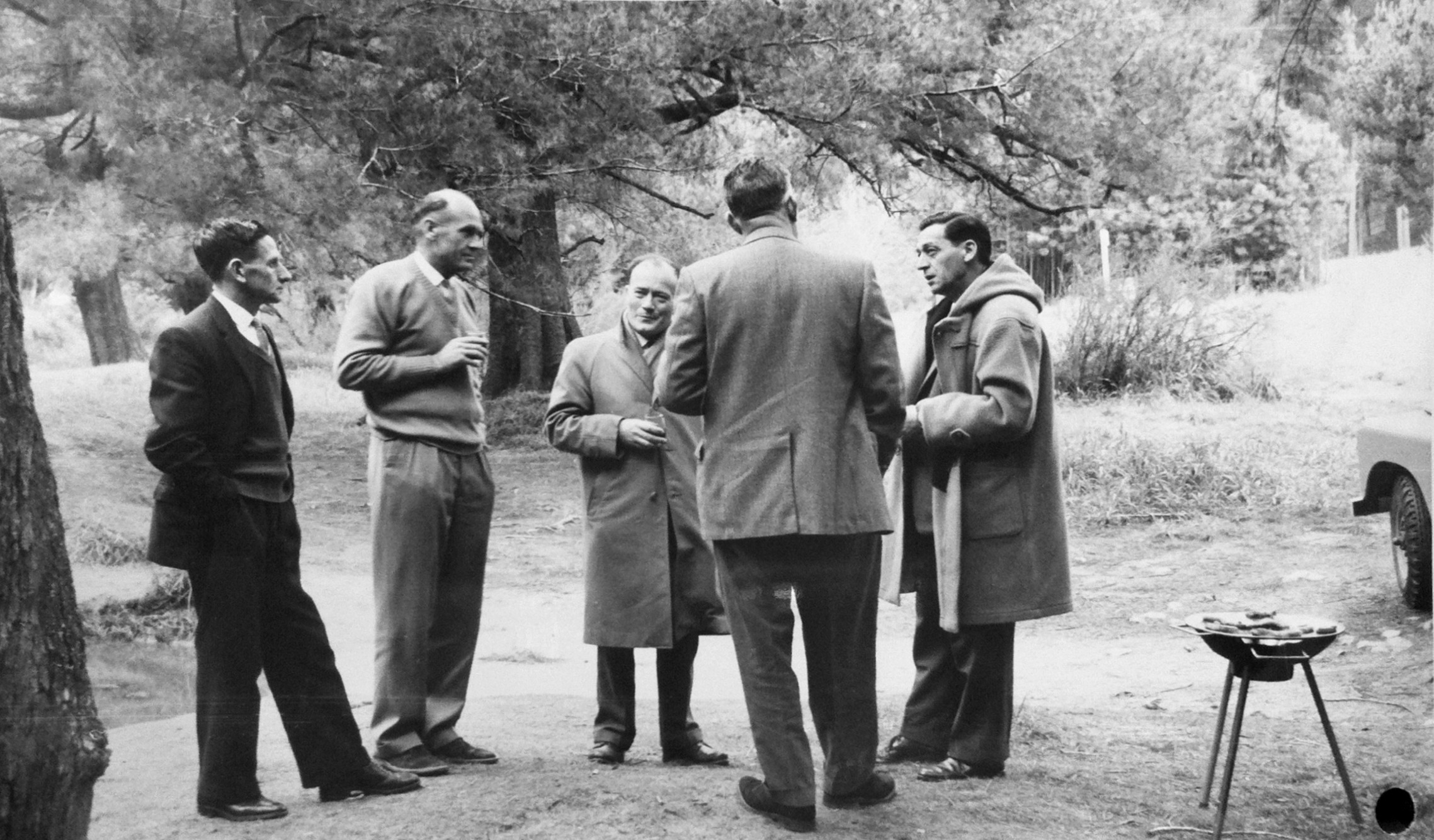 Inaugural Station Director Bob Leslie (centre) chats with an unidentified group (a note on the back of the print indicates they are Station Directors) over a BBQ lunch in this WRE photo taken on 20th August 1963.